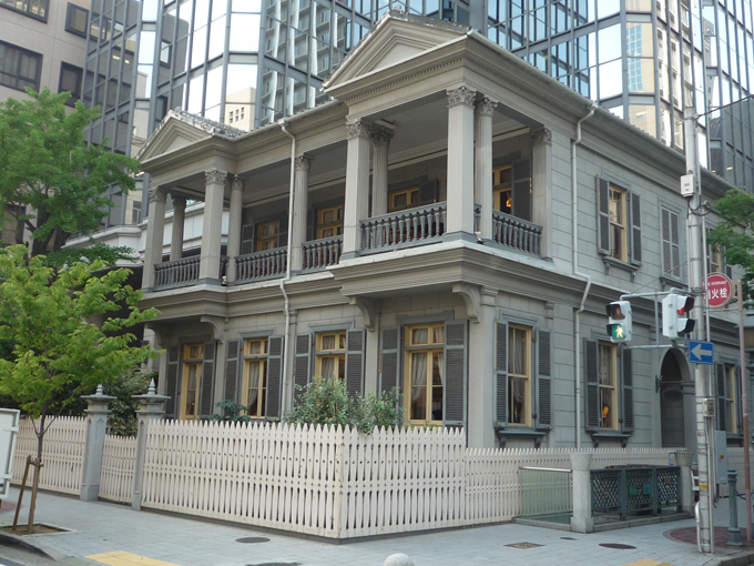 外壁石造りのベランダ・コロニアルスタイル。明治13年頃建てられたが、震災で全壊。部材を70%使用して建て替えられた。現在はレストランとして利用されている。