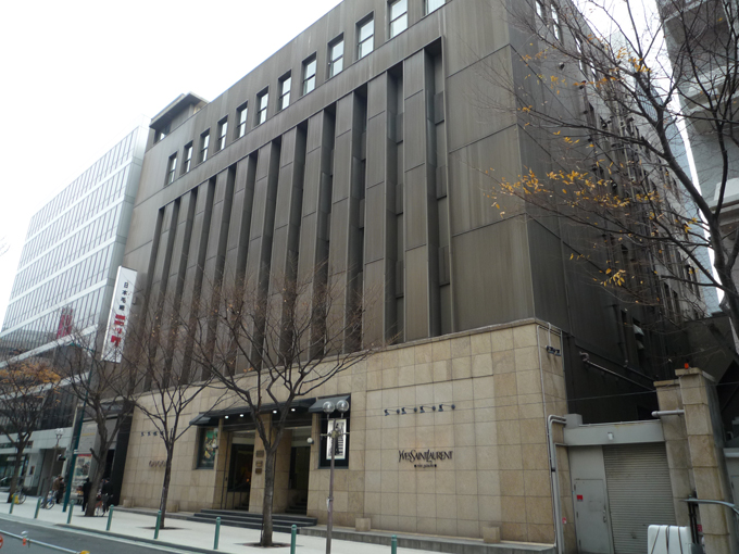 昭和12年竣工。米国スタイルのオフィスビル。1階部分が御影石づくり。2階以上がタイル貼りらしいが、剥離防止のアルミで覆われている。