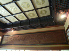 欄間の彫刻は、高村光雲の弟子、相原雲楽の手による。