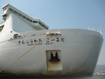 商船三井グループのフェリー「さんふらわあ」。六甲アイランドからは大分への航路。夕刻や夜に出て、翌朝大分に到着する。さまざまな企画プランがある。